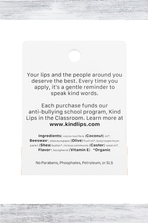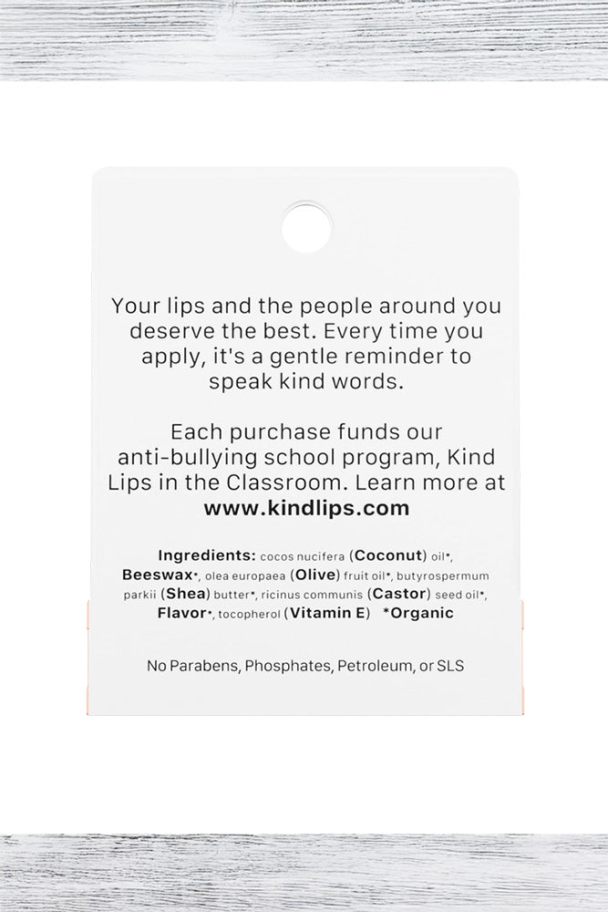 Ingredients: Coconut oil*, Beeswax*, Olive oil*, Shea butter*, Jojoba oil*, flavor*, Vitamin E. *organic